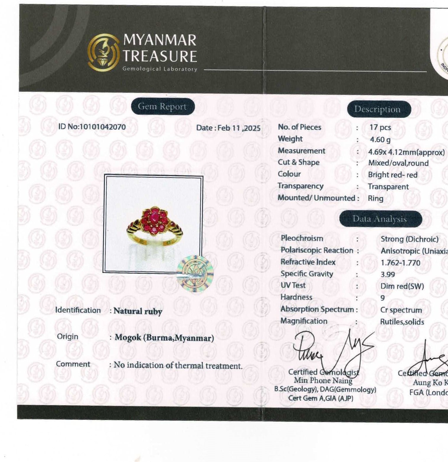 + Treatment - None (No Heated, No Treated, Not Enhanced for both Ruby and Diamonds)