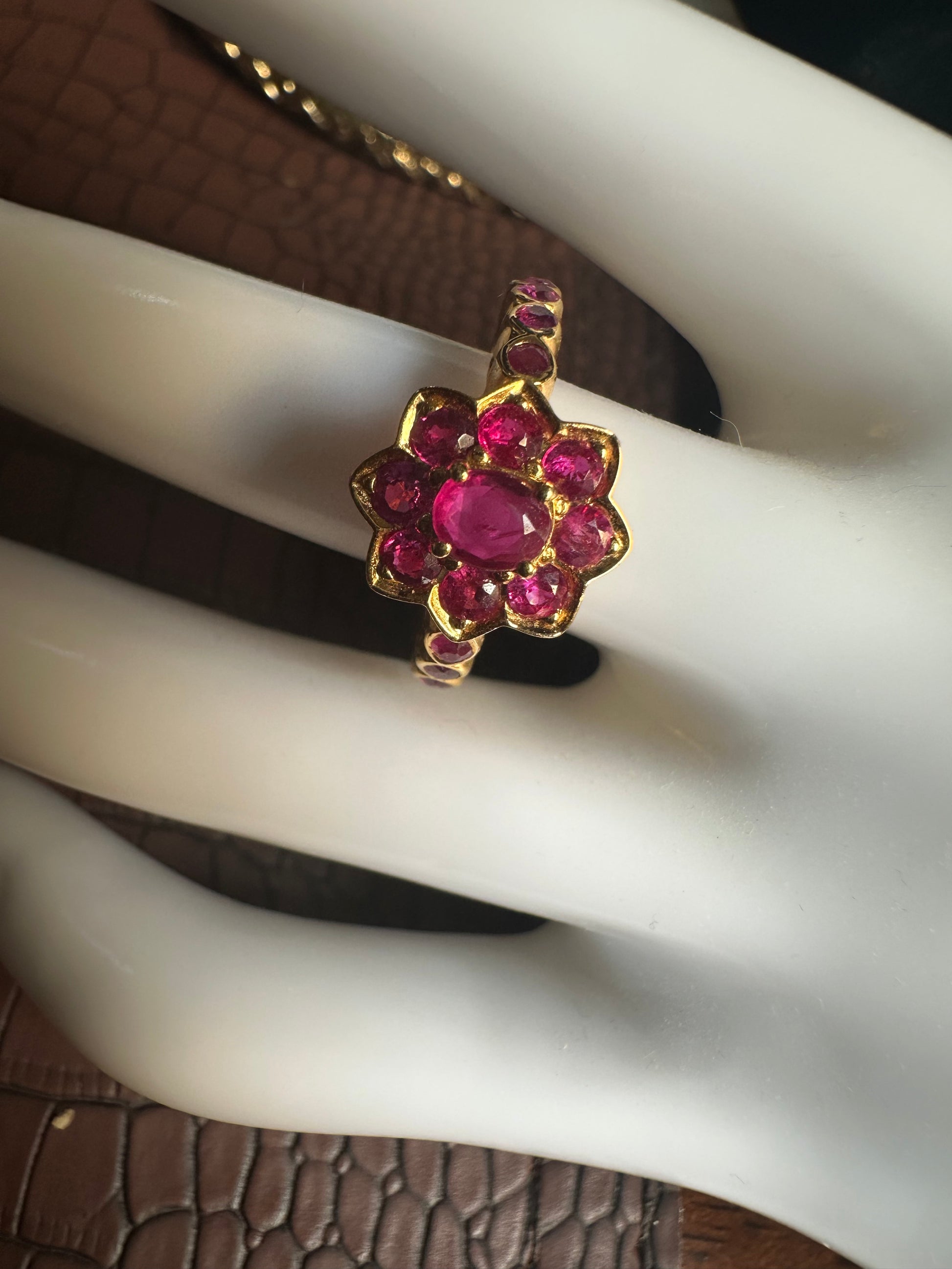 Set in 20K solid gold, the petals gracefully encircle a captivating centre ruby, symbolizing purity and strength. Every facet glows with deep, life-filled light — a hallmark of genuine Mogok rubies from Burma.