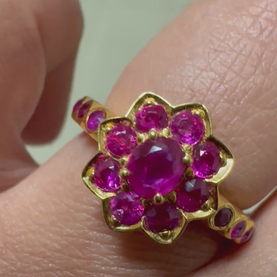 Inspired by the serene elegance of a lotus flower, this exquisite ring features a cluster of natural unheated Burmese rubies — each hand-selected for its vivid, pure crimson hue and exceptional clarity.