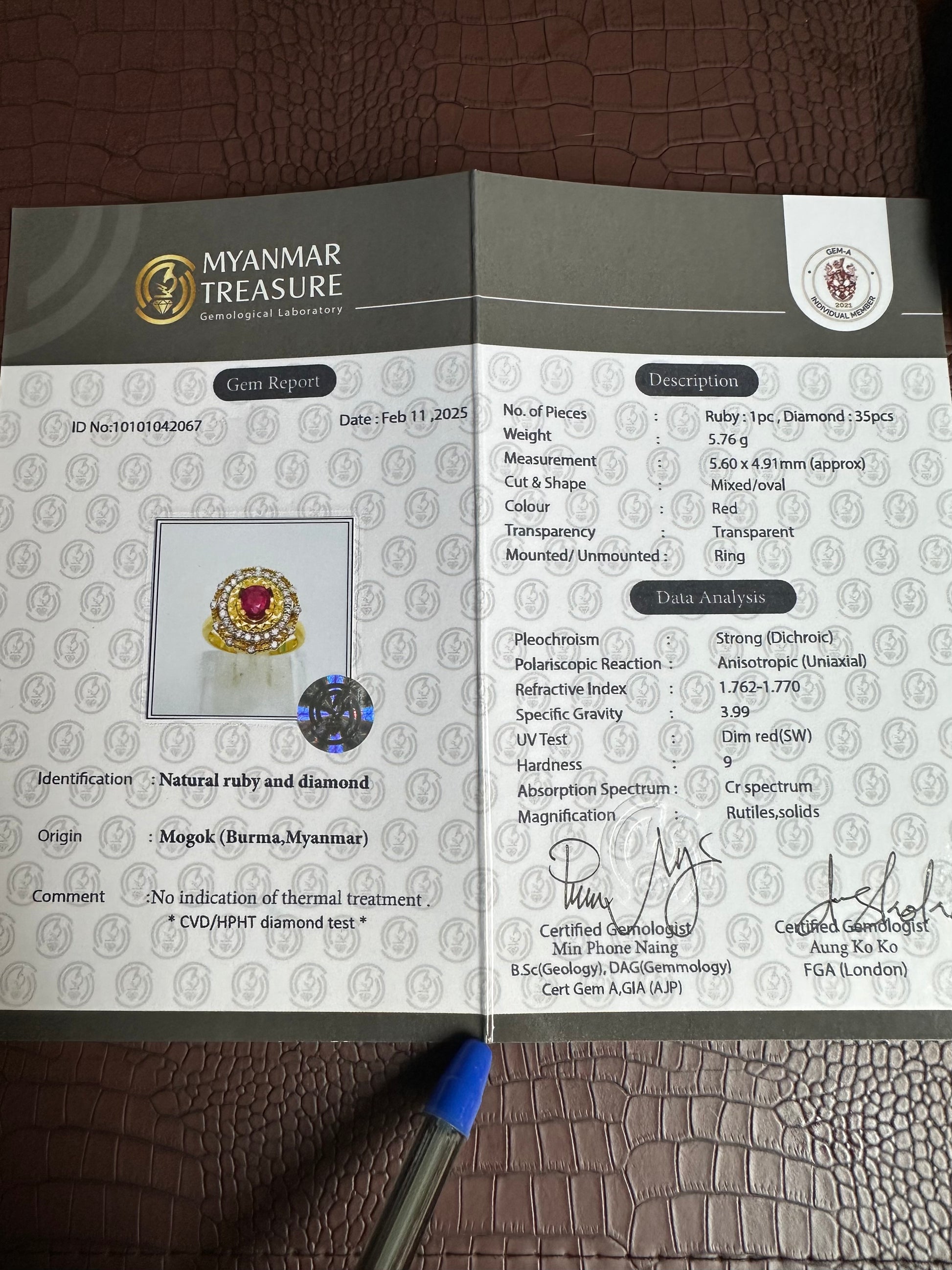 + Accompanied by a certificate from Myanmar Treasure( Gemological Laboratory, Myanmar)ย affirming the Burmese (Mogok Region) origin of the Ruby, with no indications of heating, and certifying the natural authenticity of diamonds (Moissanite, CVD & HPHT testing successfully passed).