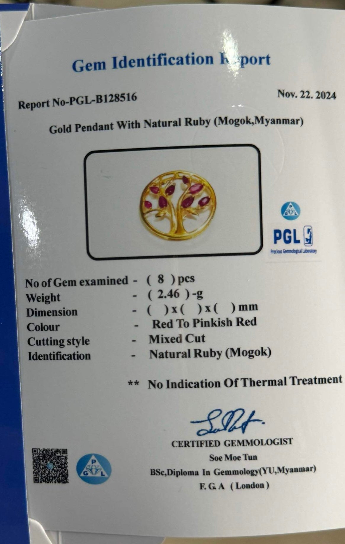+ Accompanied by a certificate from Myanmar Treasure( Gemological Laboratory, Myanmar)