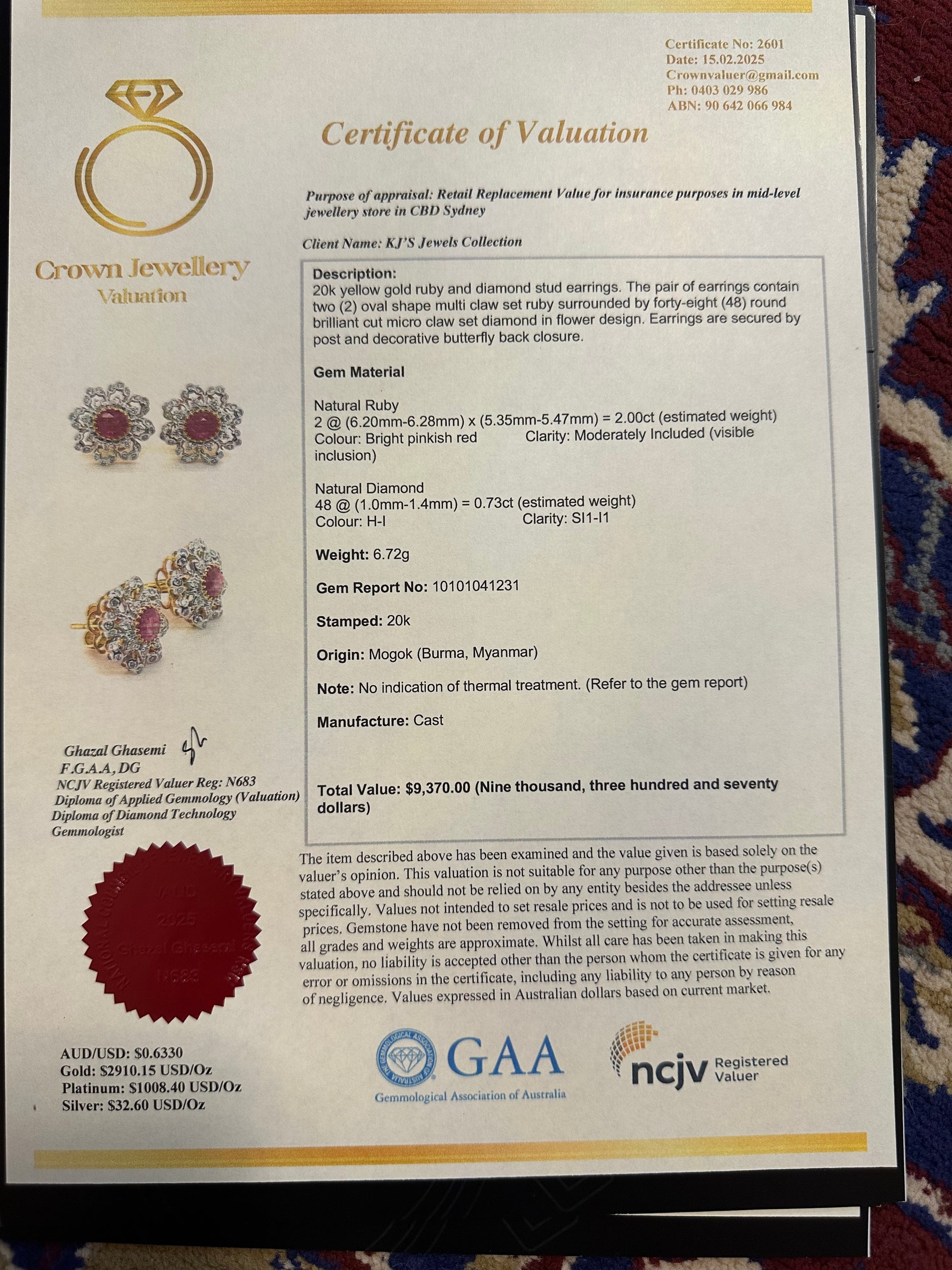 20K yellow gold, ruby and diamond stud earrings. The pair of earrings features two oval-shaped, multi claw set rubies surrounded by forty-eight (48) round brilliant-cut, micro-claw-set diamonds in flower design. Earrings are secured by a post and butterfly back closure.