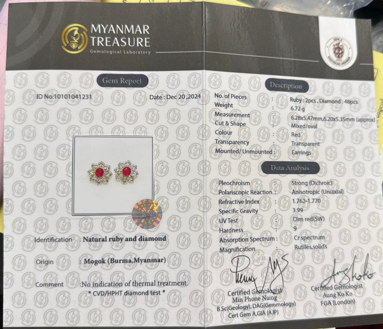 + Accompanied by a certificate from Myanmar Treasure( Gemological Laboratory, Myanmar)