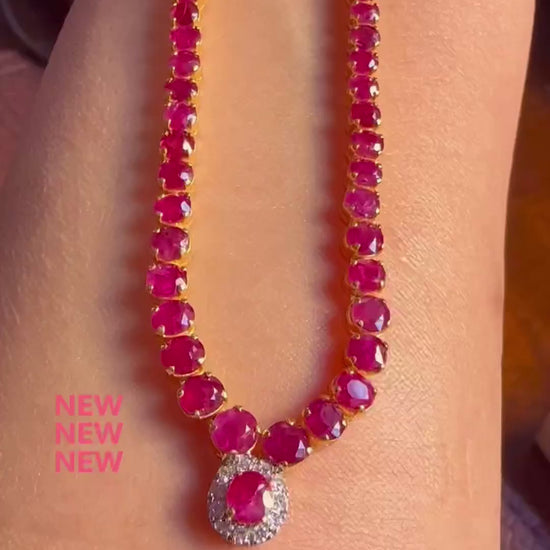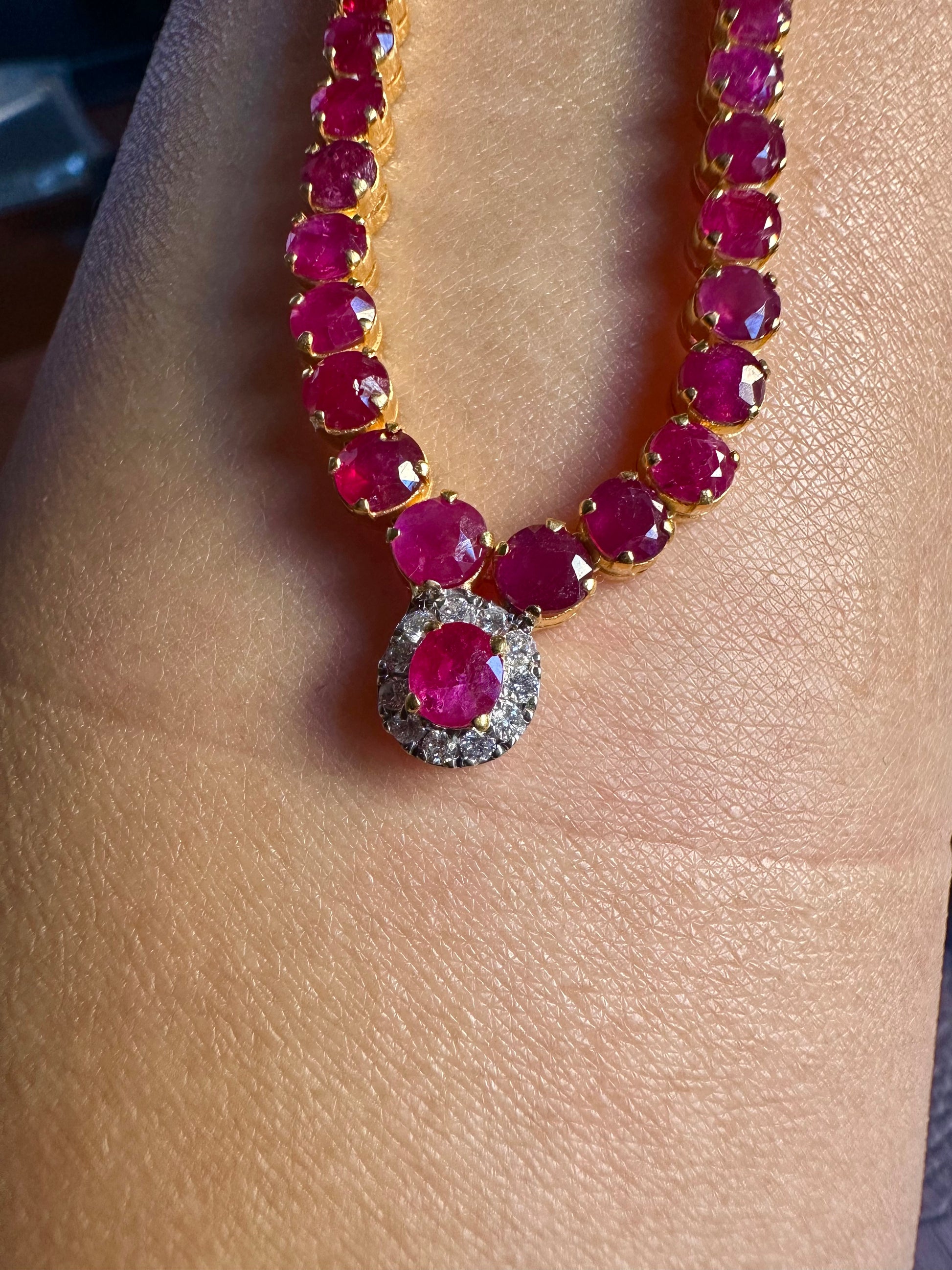 Turn every moment into a statement of luxury with this hand-crafted natural ruby necklace, set in 20K solid gold. Each vivid red ruby is carefully matched for color and brilliance, leading to a dazzling centerpiece surrounded by shimmering diamonds. 💎❤️