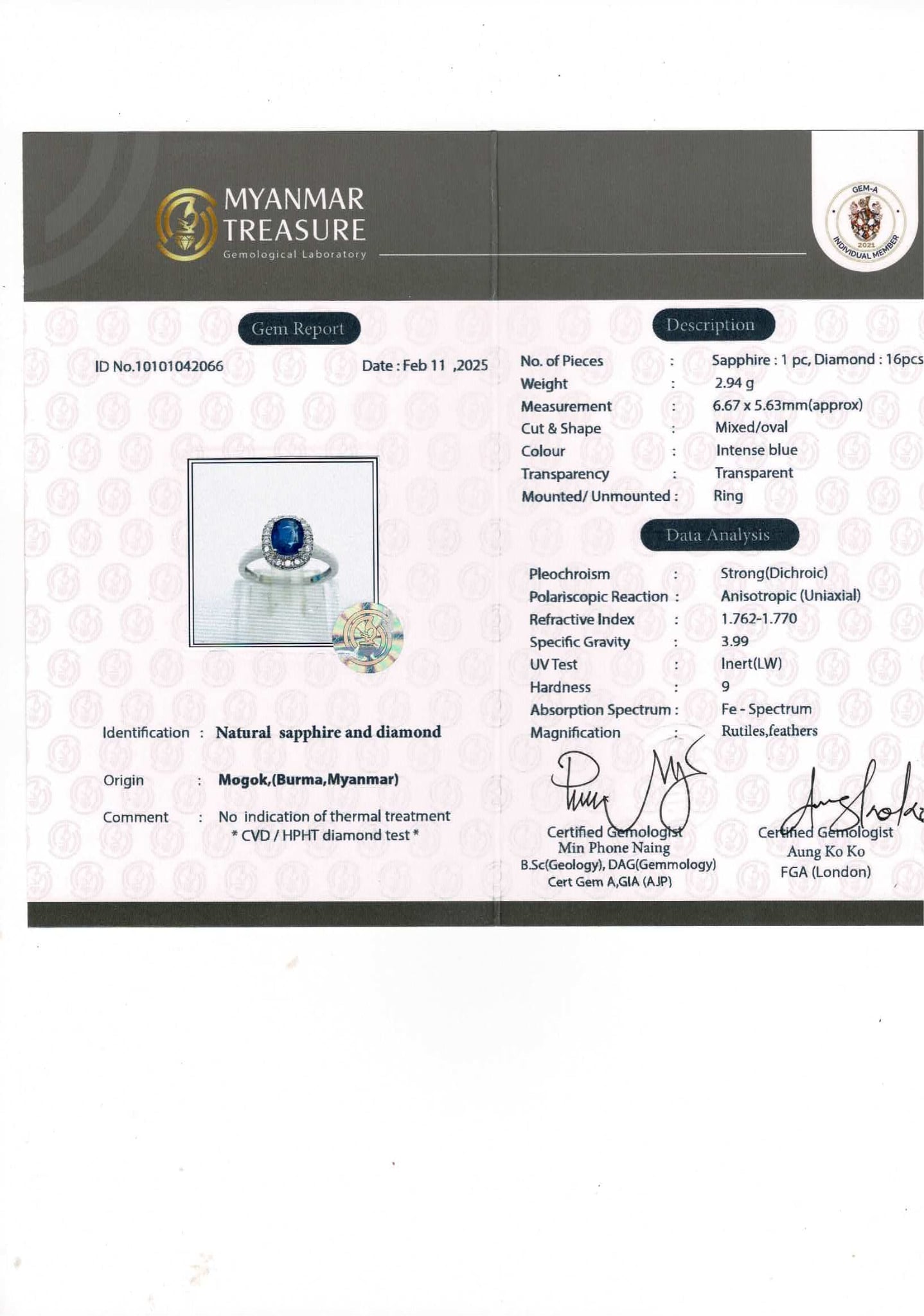 affirming the Burmese (Mogok Region) origin of the Sapphire, with no indications of heating, and certifying the natural authenticity of diamonds (Moissanite, CVD & HPHT testing successfully passed).