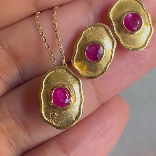 Hand-hammered gold meets the vivid brilliance of natural rubies. Organic texture, bold design, unmistakable craftsmanship. A refined trio set that commands elegance in every glance.