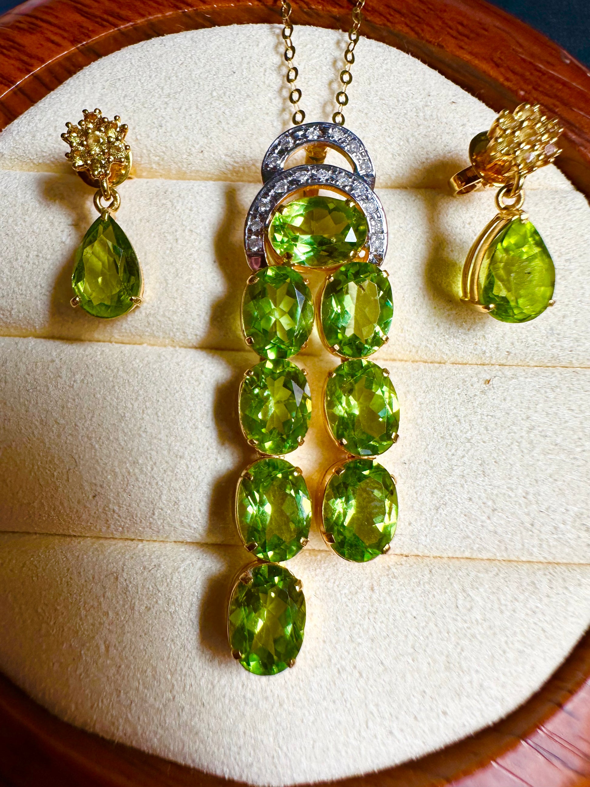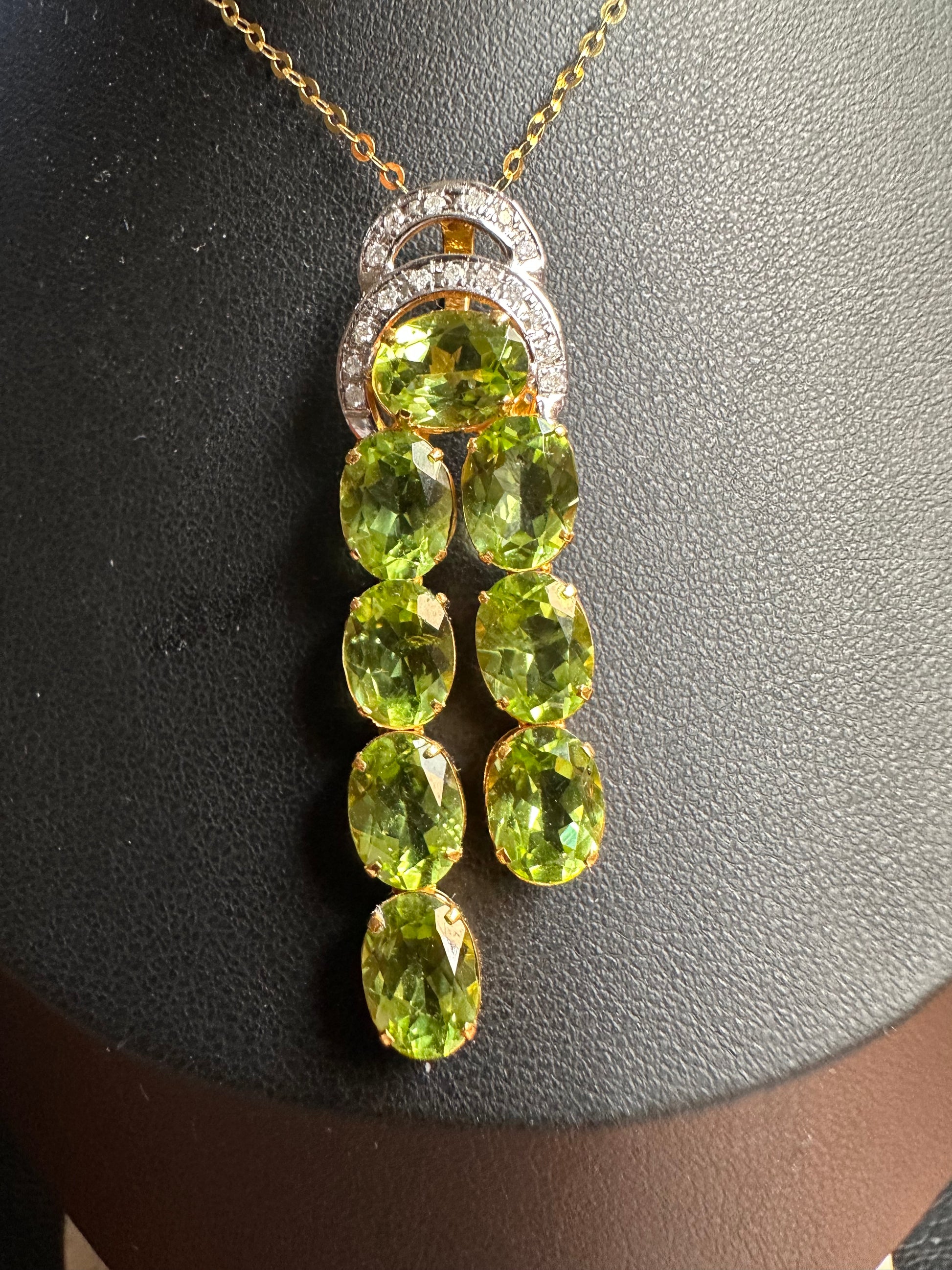 18CT yellow gold peridot and diamond pendant featuring eight (8) oval shape four claw set period decorated by seventeen (17) round brilliant cut micro claw set diamonds, including attached bail.