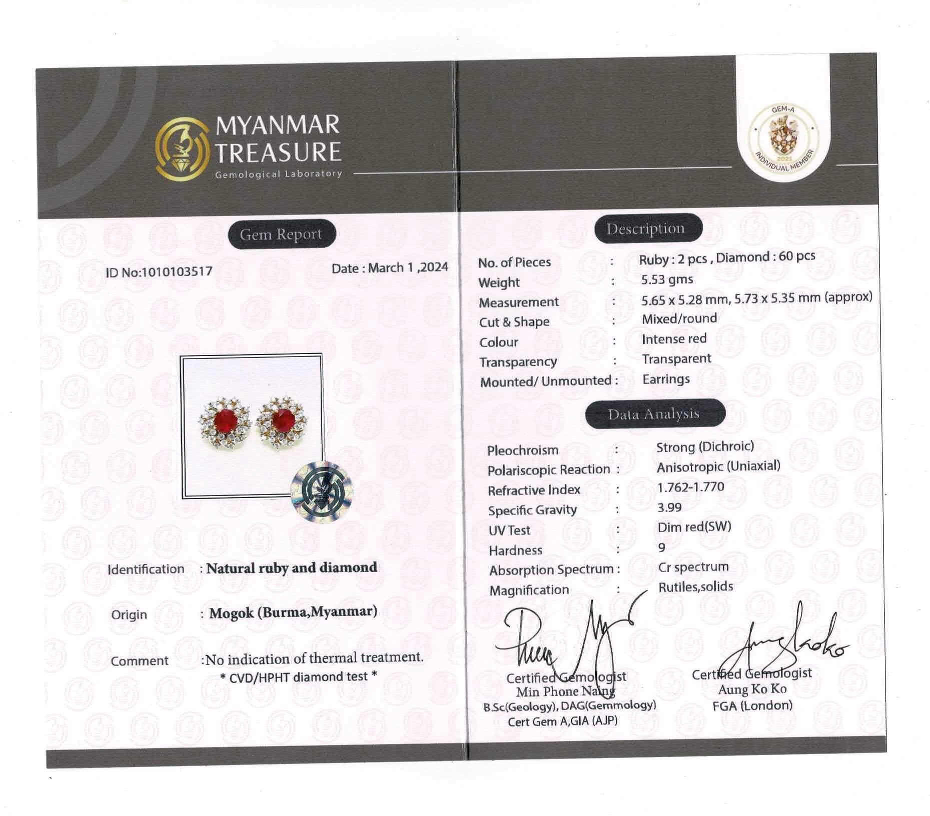 2.01CT Burmese Natural Unheated Ruby and Natural Diamonds Earrings in 18K Solid White Gold