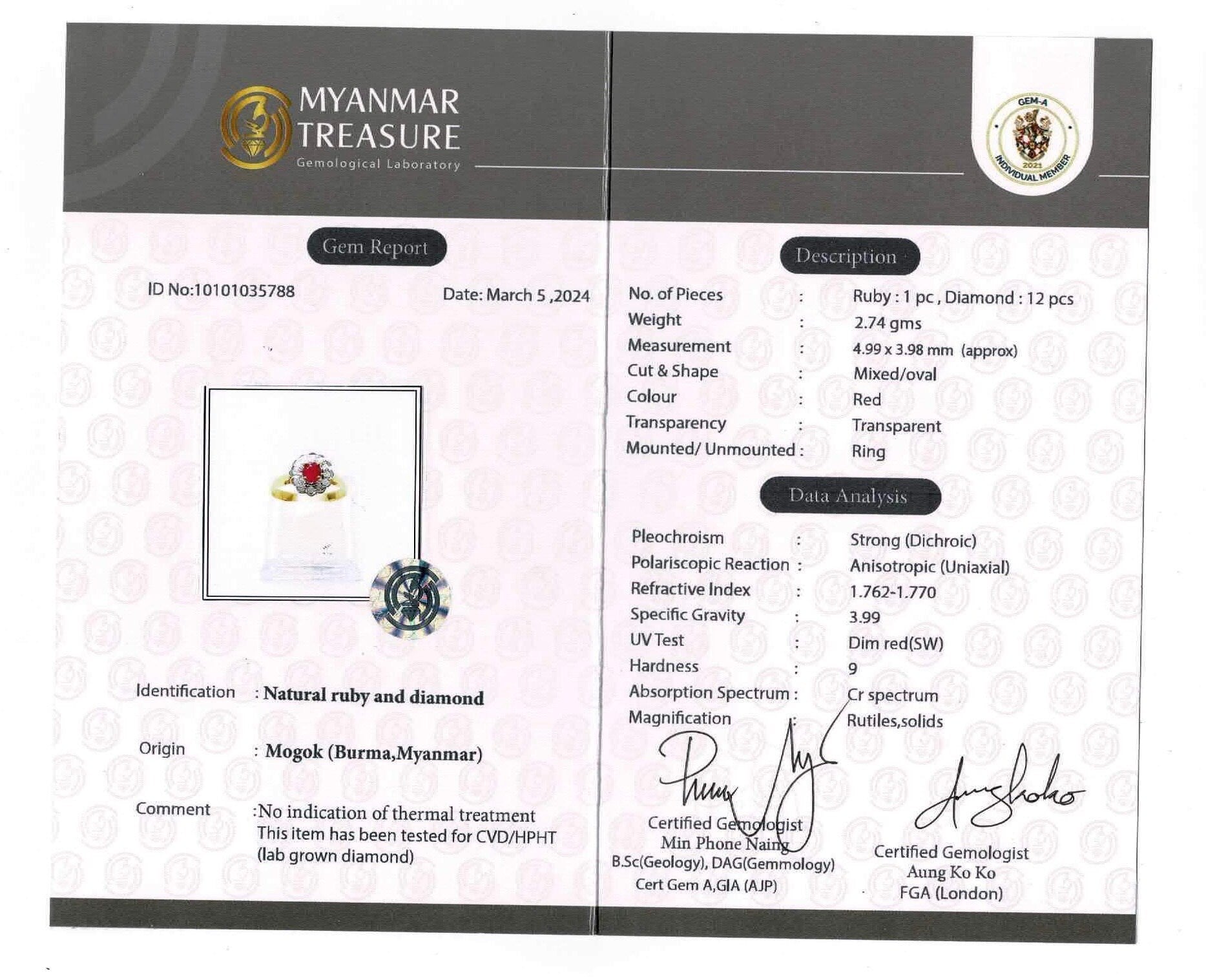 Burmese Unheated Ruby and Natural Diamonds Ring in 20K Solid Gold