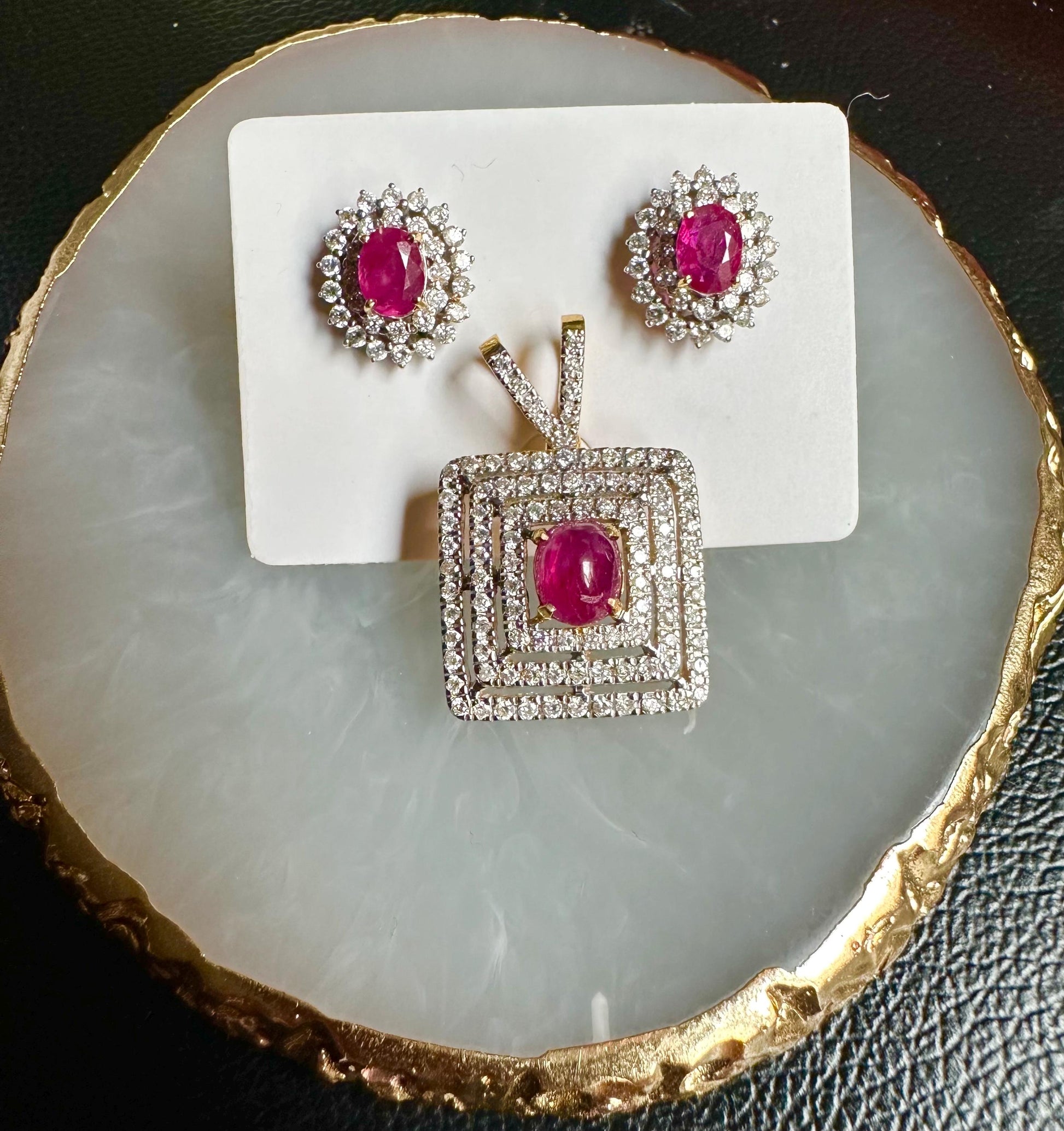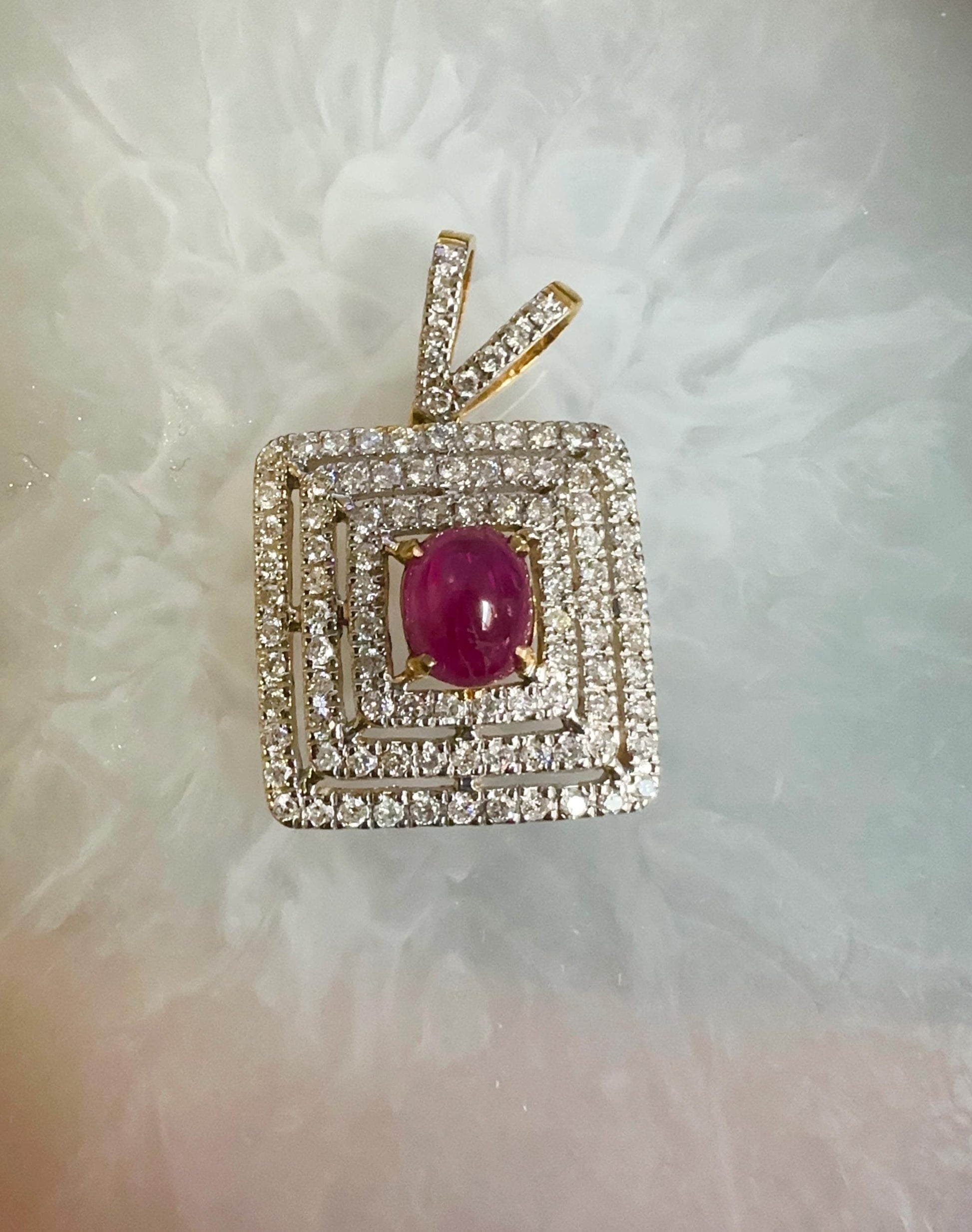 Natural Unheated Cabochon Burma Ruby (1.5CT) and Natural Diamonds in 20K Solid Gold Pendant
