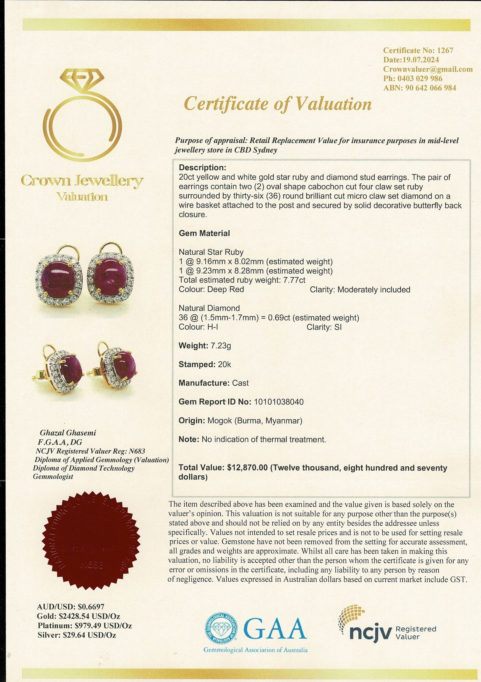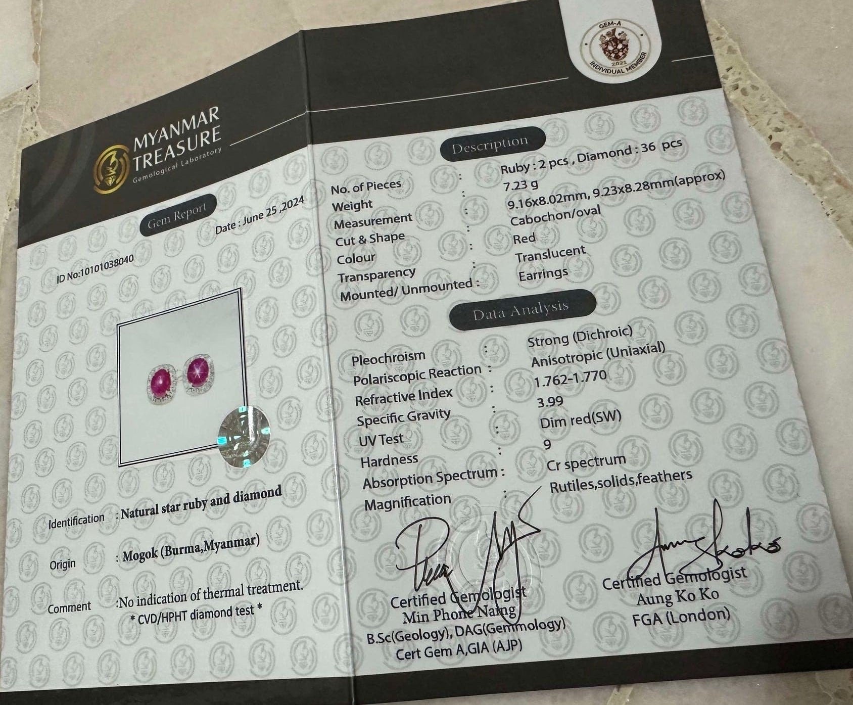 Oversized Natural Unheated Burmese Star Ruby (7.77CT) Earrings with Natural Diamonds in 20K Gold PRICE: $0, VALUATION: $12,870 by NCJV Registered Valuer Reg: N683 ð ðððð®ð«ðð¬ : + Main Gemstone - Burmese Unheated Natural Star Ruby + Total Carat Weight of Ruby (2pc) â 7.77 (approx) + Color â Deep Red + Clarity â Moderately Included as Natural Unheated Gems + Origin - Mogok (Burma, Myanmar) + Additional Supporting Gemstone - Untreated Natural Diamonds + Ring: Total Carat Weight of Diamonds (36pcs) - 0.69CT (approx) + Metal - 20K solid gold + Treatment - None (No Heated, No Treated, Not Enhanced for both Ruby and Diamonds) + Condition - Brand New + Areas of Damage â None + Weight:7.23g + Accompanied by a certificate from Myanmar Treasure( Gemological Laboratory, Myanmar) affirming the Burmese (Mogok Region) origin of the Ruby, with no indications of heating, and certifying the natural authenticity of diamonds (Moissanite, CVD & HPHT testing successfully passed). + Accompanied by an independent valuation certificate by Australia, NCJV Registered Valuer (Reg: N683) ððð²ðŠðð§ð & ððð¥ð¢ð¯ðð«ð² : + Lay by installment is available. Please message for discussion. + Australian Business Register (ABN) No: 41572864744 + Website: https://kjsjewelscollection.etsy.com/ + Facebook: https://www.facebook.com/KJsJewelsCollection + Instagram: https://www.instagram.com/kjsjewelscollection ðð¢ð¬ðð¥ðð¢ðŠðð«: The true color may vary slightly from what is displayed in product images due to different screens and resolutions. However, the difference should not be significant. Please check the measurements in the valuation report, as some pictures may be enlarged to reveal details. ðð«ð ð®ð§ð¡ððððð ð«ð®ðð¢ðð¬ ðð§ð ð¬ðð©ð©ð¡ð¢ð«ð ðð«ð ðŠðšð«ð ð¯ðð¥ð®ððð¥ð? This holds especially true for rubies and sapphires, where the price difference between heated and unheated stones can be considerably higher. Heating is a process that involves exposing the natural gemstones to extremely high temperatures to enhance their appearance and intensify their color. Unheated rubies and sapphires display their natural color and characteristics, showcasing the genuine beauty of the gemstone without any enhancements. However, they both fall under the category of natural gems, with untreated gems considered more valuable, often commanding prices 2-5 times higher than treated stones. Moreover, Burmese Sapphires and Rubies are highly prized in the international market for their exceptional quality, unique color, and historical significance. The finest quality Burmese rubies and sapphires are rare and in high demand among collectors and high-end jewelry designers.