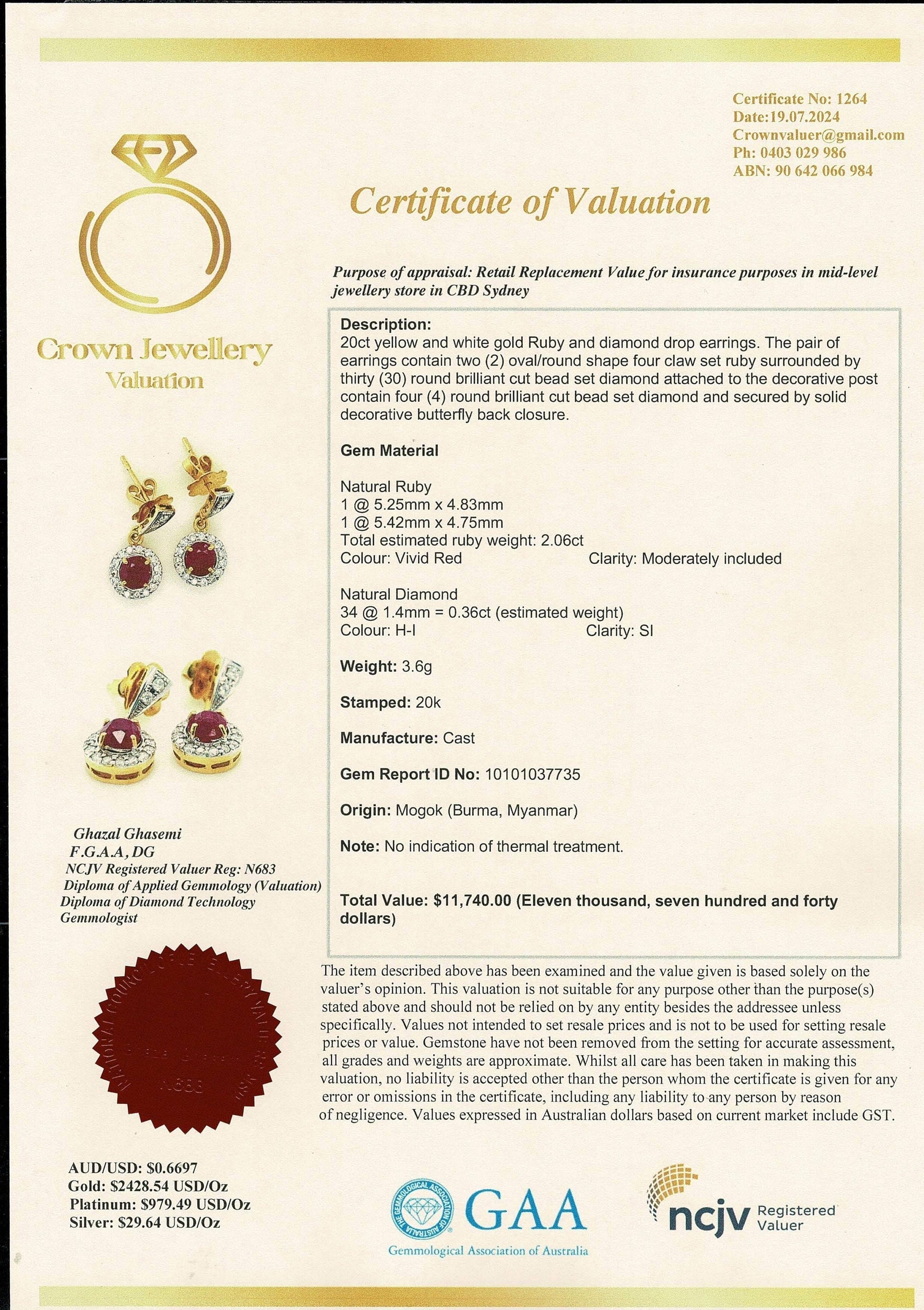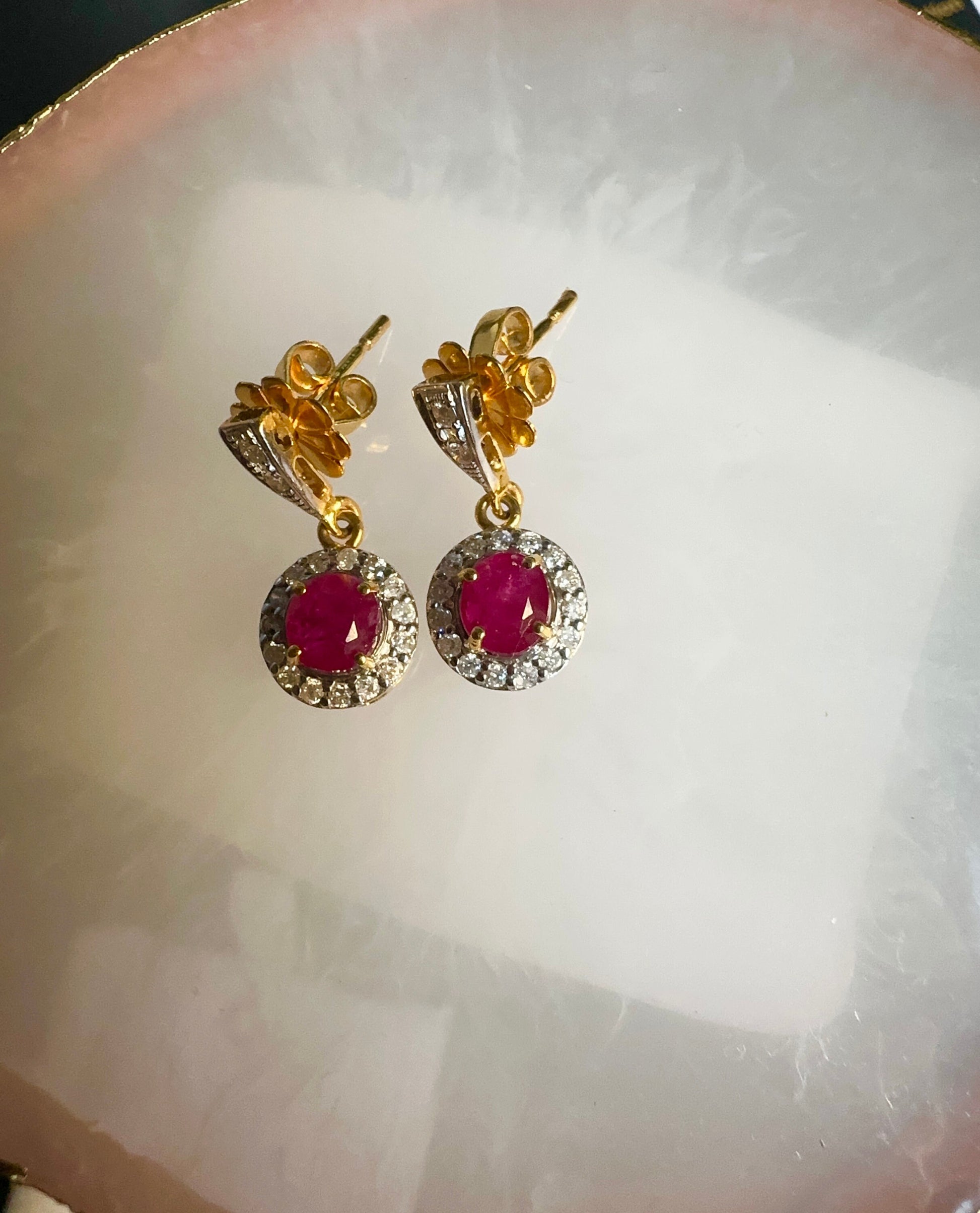 Teardrop style Natural unheated Burmese ruby (2CT) and natural diamond earrings in 20K solid gold