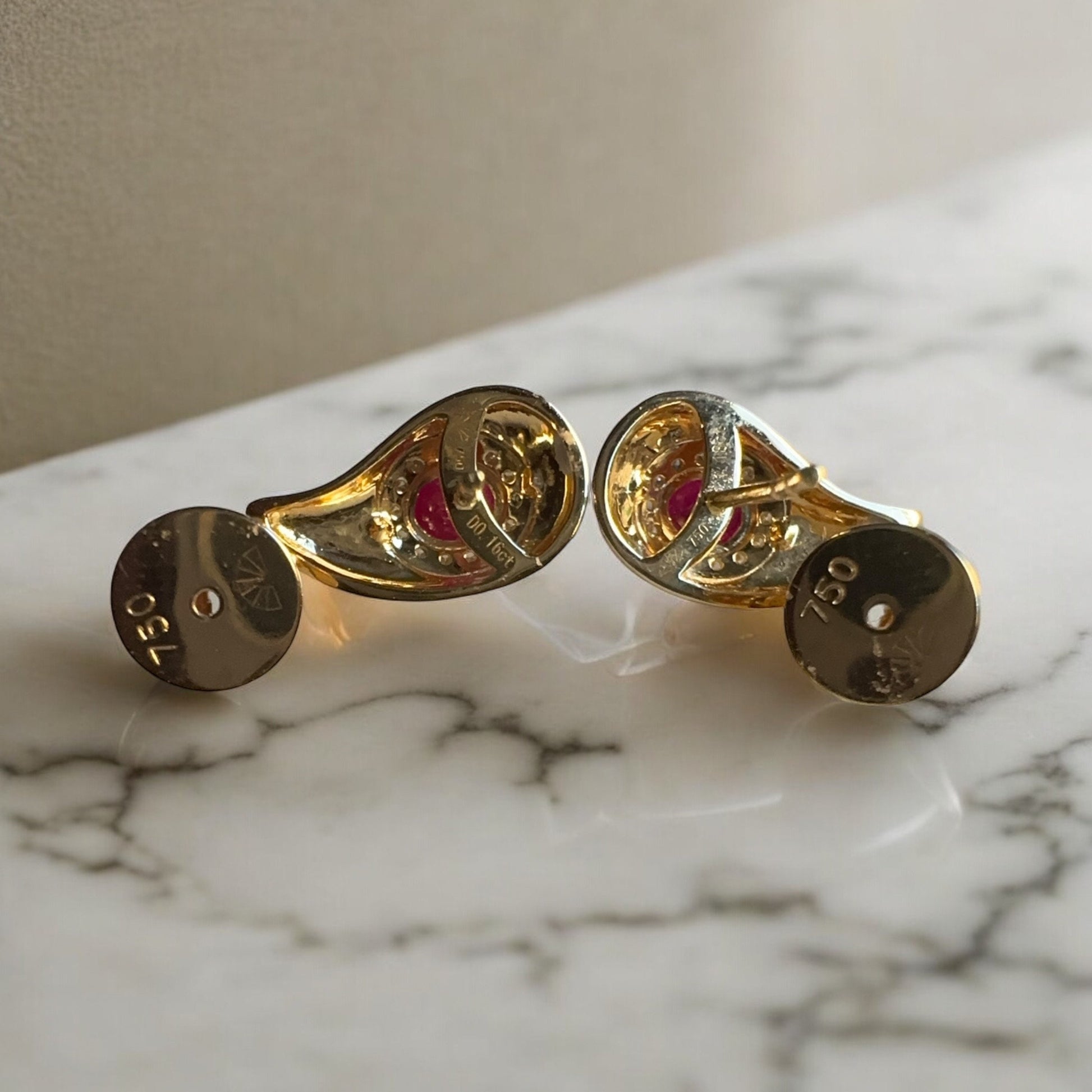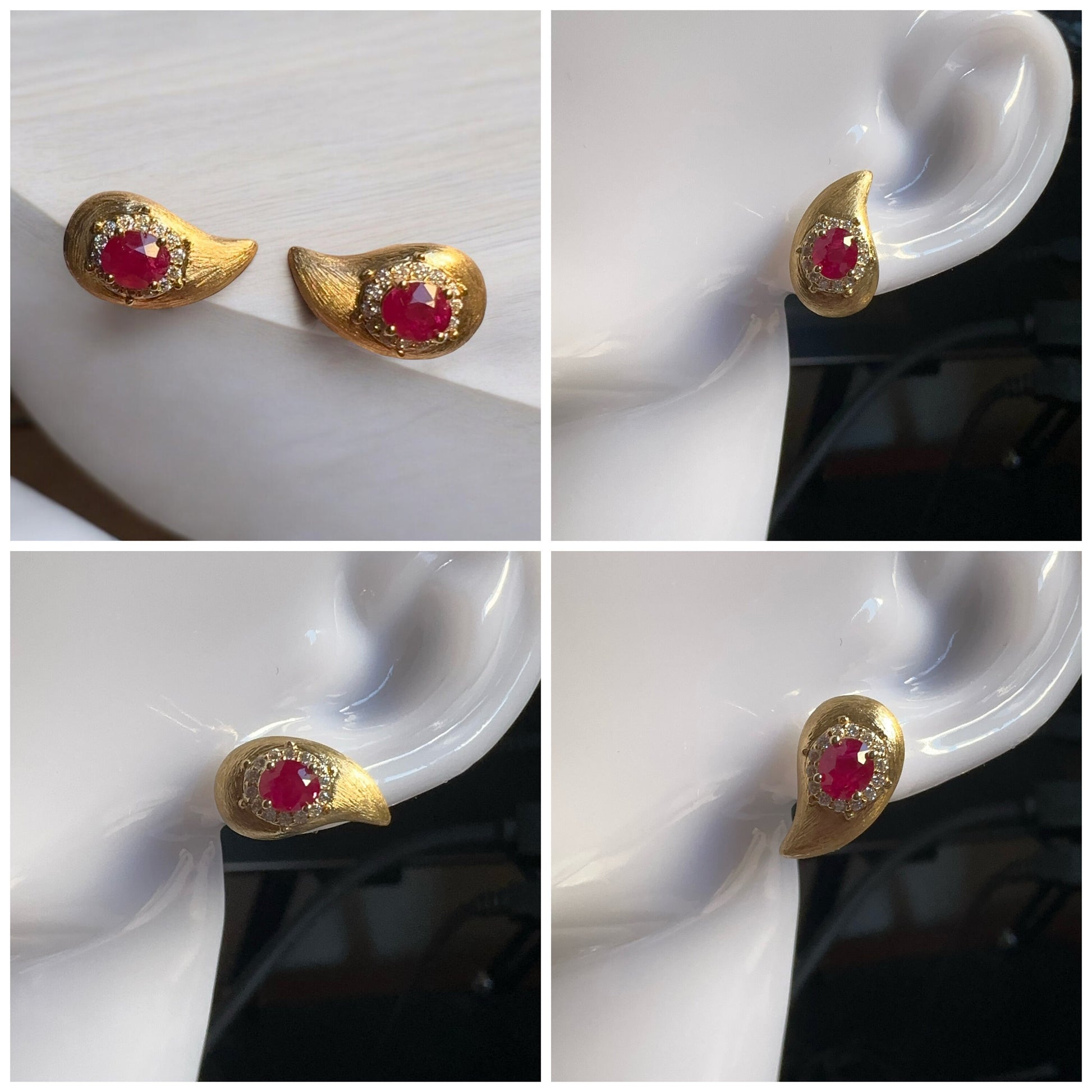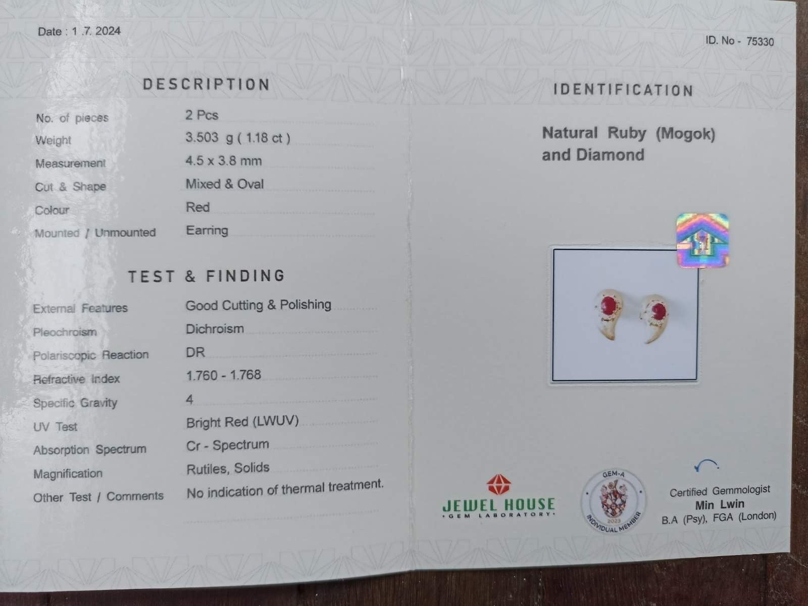 Vintage Style Natural Unheated Burmese Ruby (1.18CT) and Natural Diamonds Earrings in 18K Solid Yellow Gold