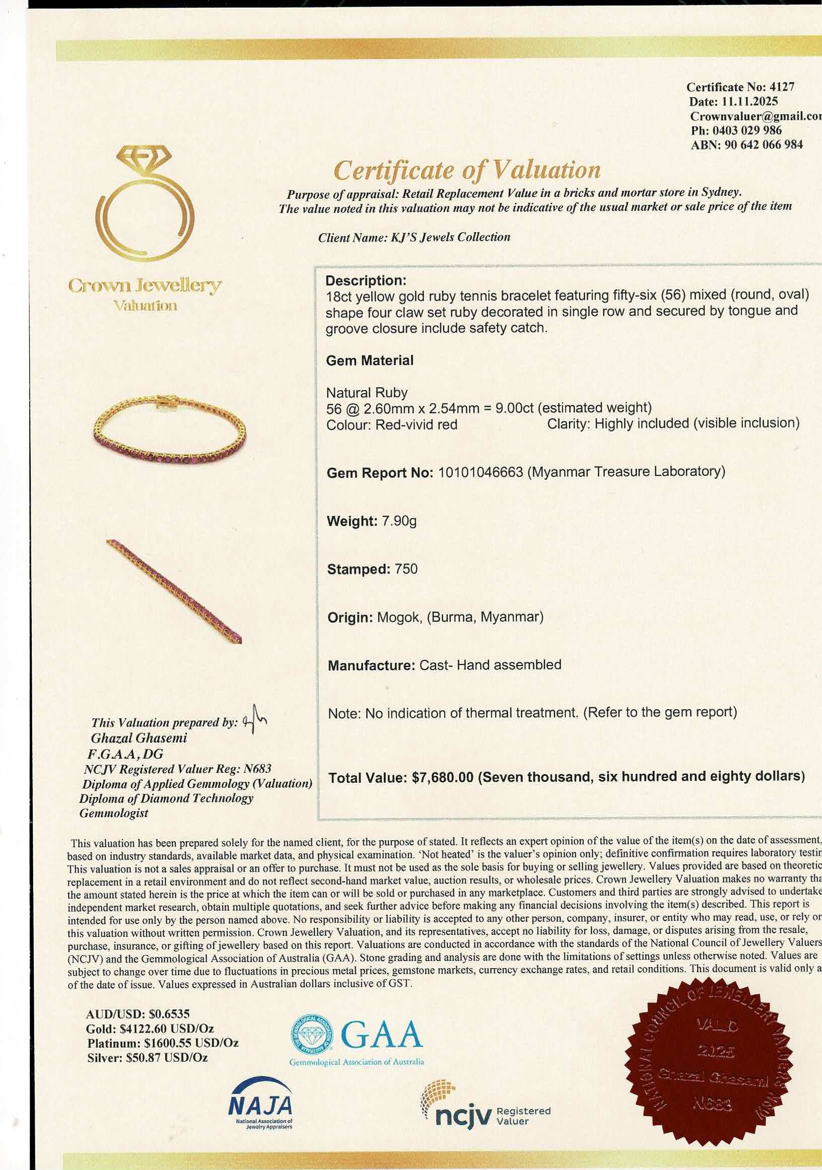 18ct yellow gold ruby tennis bracelet featuring fifty-six (56) mixed (round, oval) shape four claw set rubies, decorated in a single row and secured by tongue and groove closure including safety catch.