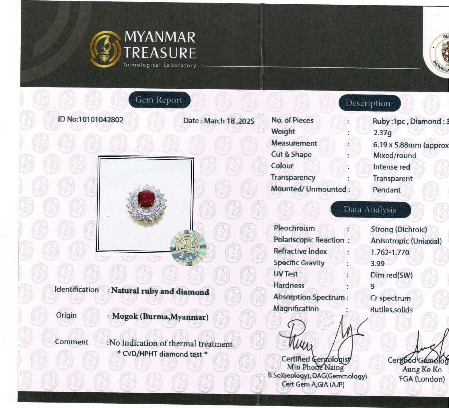 affirming the Burmese (Mogok Region) origin of the Ruby, with no indications of heating, and certifying the natural authenticity of diamonds (Moissanite, CVD & HPHT testing successfully passed).