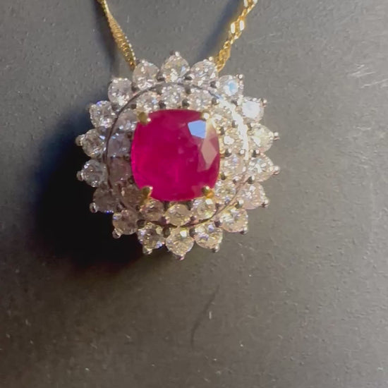 Two Halo Brilliance: Natural Diamonds & Natural Unheated Burmese Ruby (1CT) Pendant with Solid Gold Chain
