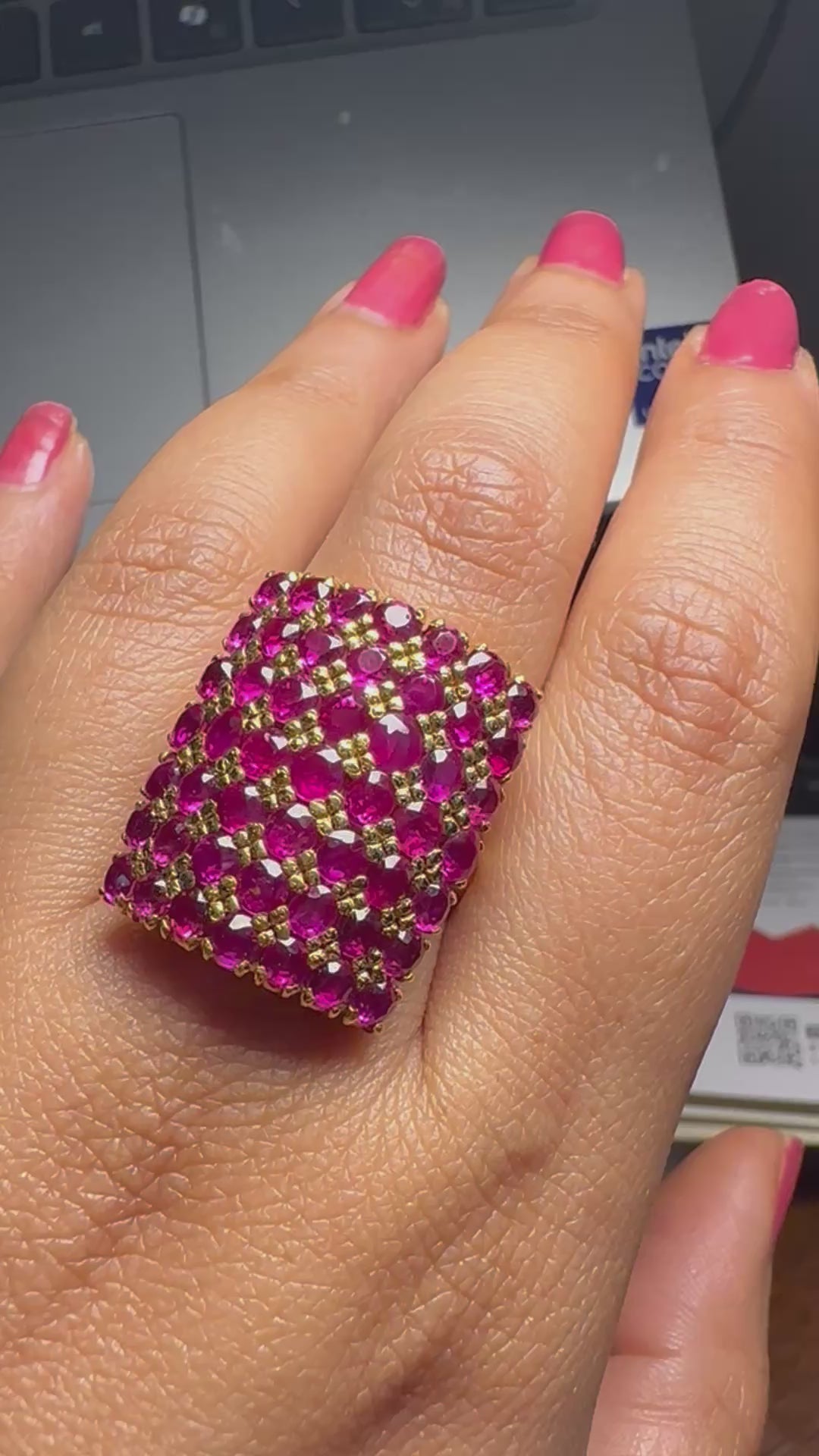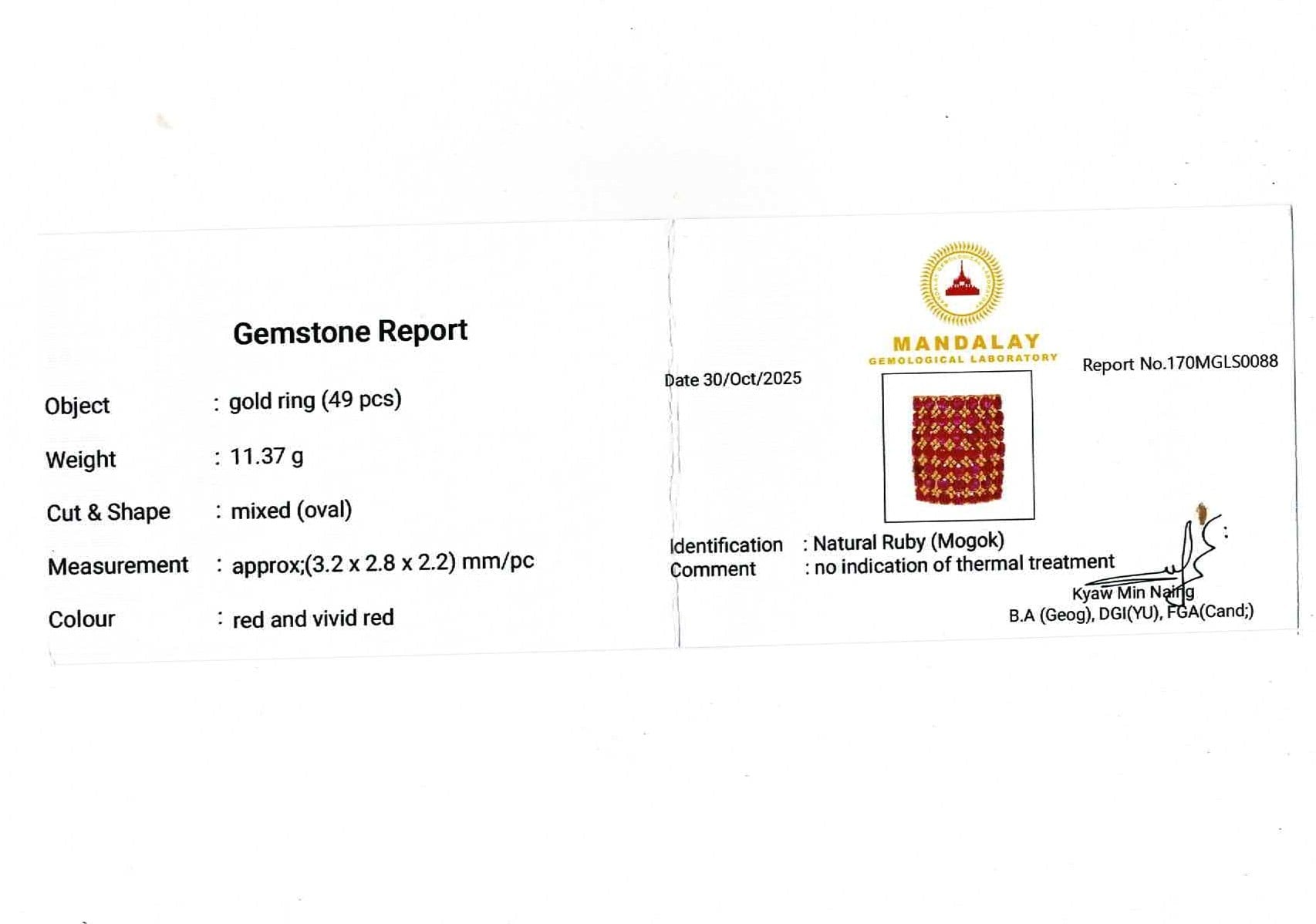 18ct yellow gold ruby dress ring featuring forty-nine (49) mixed (oval-round) shape shared claw set ruby decorated in a basket setting with an upswept shoulder on a 3.52mm half round band.